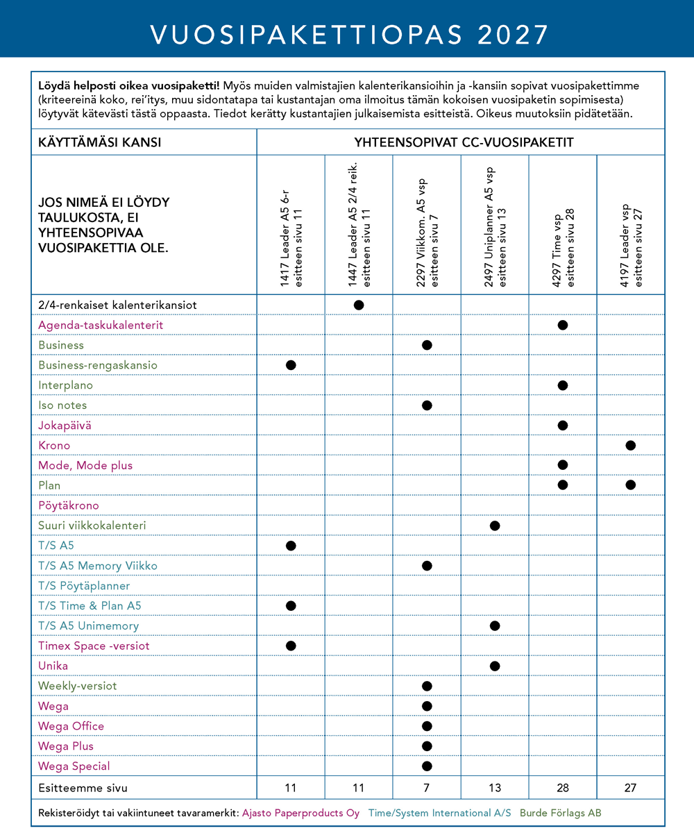 Löydä helposti oikea vuosipaketti! Myös muiden valmistajien kalenterikansioihin ja -kansiin sopivat vuosipakettimme (kriteereinä koko, rei’itys tai muu sidontatapa) löytyvät nopeasti ja varmasti tästä oppaasta.